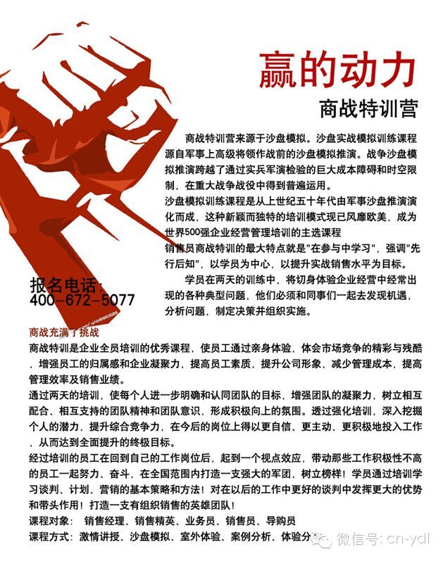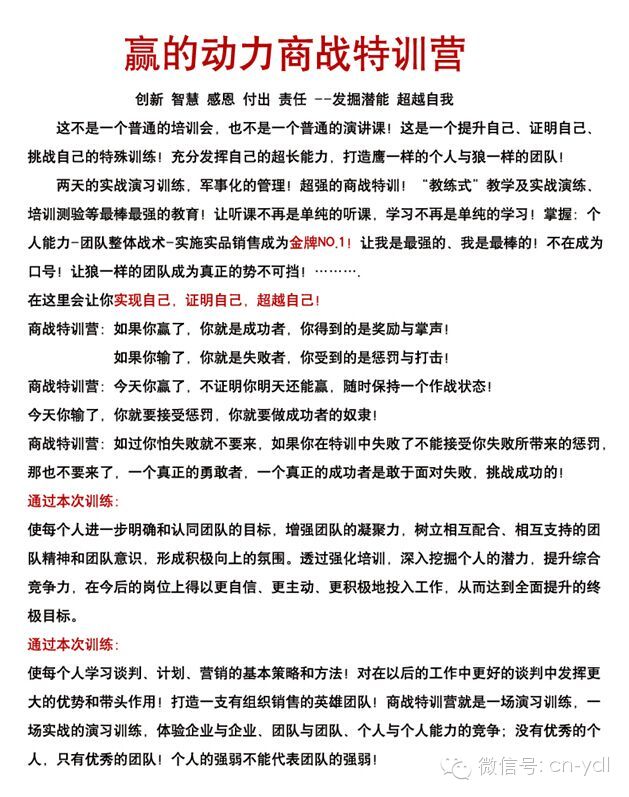 商戰(zhàn)特訓(xùn)營:如過你怕失敗就不要來,如果你在特訓(xùn)中失敗了不能接受你失敗所帶來的懲罰,那也不要來了,一個真正的勇敢者,一個真正的成功者是敢于面對失敗,挑戰(zhàn)成功的!